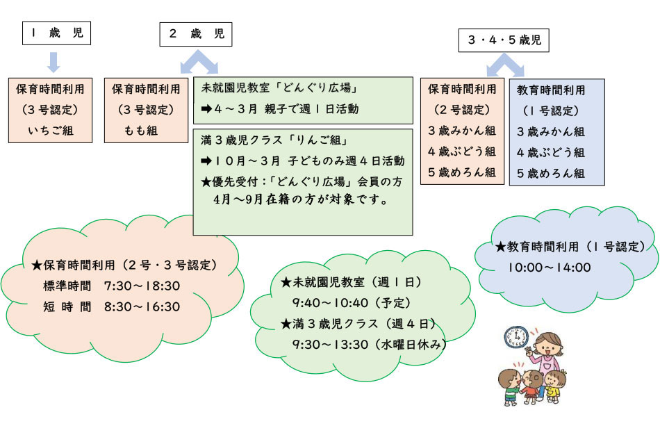※2歳児クラスは1歳児クラスの園児が進級するため、4月に定員を満たしている場合は、新規の園児の受入れがありませんのでご承知おきください。