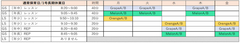| REP | 在園児のGSのみ対象 水・金(週2回)参加任意 LSはありません ★REPとはRepeated Exposure of Practice(繰り返しの体験)の略で、原則、家庭で行う予習復習の学習です。 |